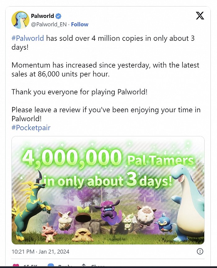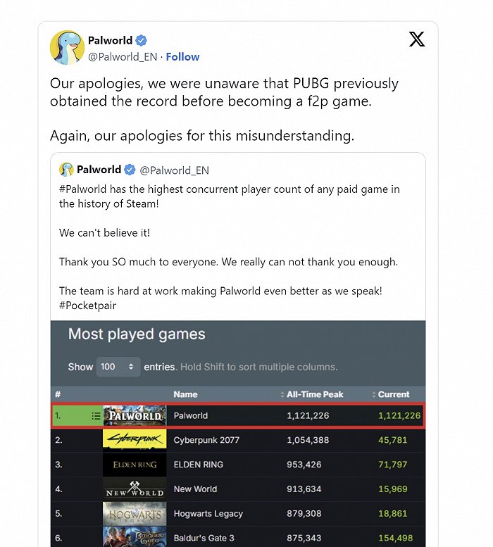 Pocketpair宣布《幻兽帕鲁》成为Steam历史上同时在线人数最高的付费游戏,仅次于免费前的《绝地求生》。