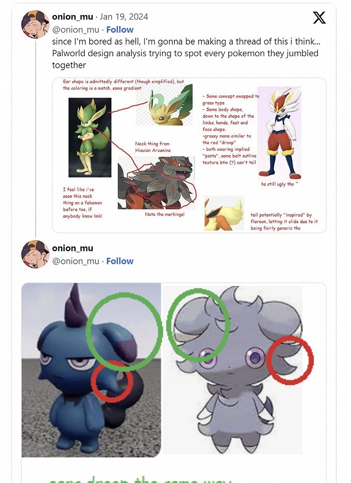 社交平台X上用户罗列《幻兽帕鲁》的疑似抄袭宝可梦精灵痕迹。