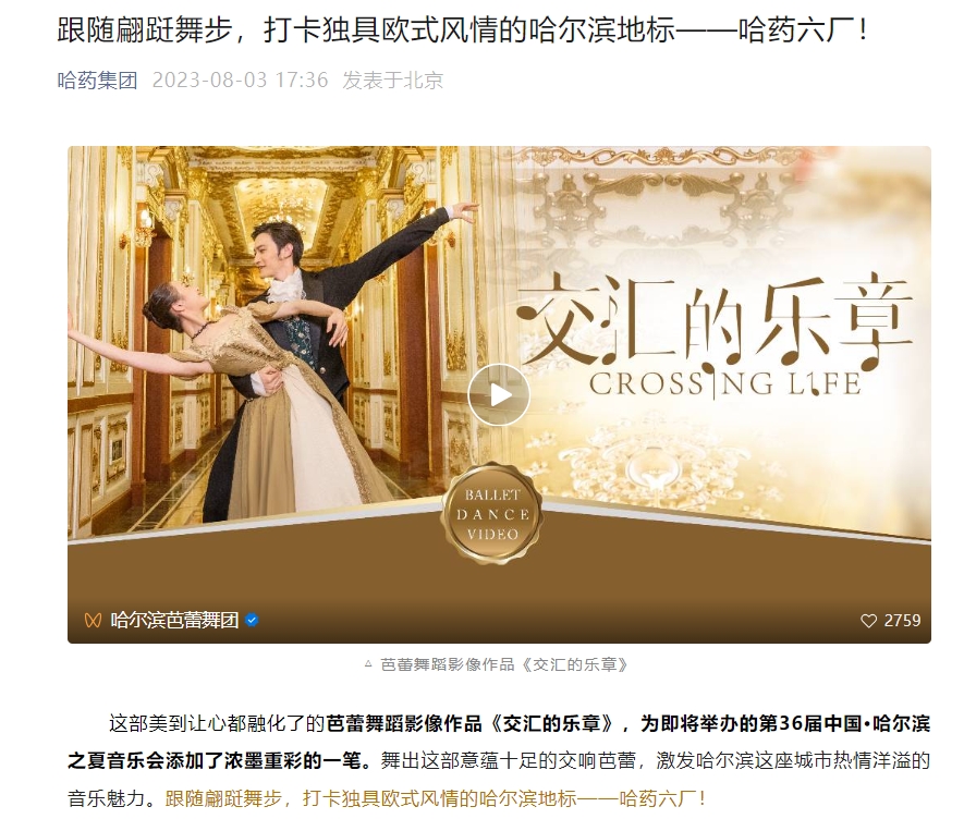 哈药集团官网微信号曾在2023年8月曾发文称,独具欧式风情的哈尔滨地标——哈药六厂,并表示,一部芭蕾舞蹈影像作品的拍摄地点就在哈药六厂。
